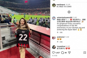 花滑名将隋文静社媒晒照,现场观战米兰vs科莫并手持米兰22号球衣