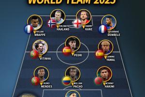 体育资讯12月28日讯 IFFHS(国际足球历史和统计联合会)近日公布了2025年年度最佳阵容评选结果,姆巴佩、哈兰德、凯恩、登贝莱等11人入选。