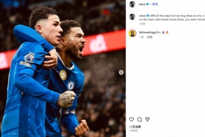詹姆斯晒出自己和进球功臣恩佐的庆祝照,并配文:“这几天很艰难,但我们团结一心,坚持了下来。这是征途中的一处难关。一路平安,蓝军球迷们,你们今晚的表现太棒了!”
