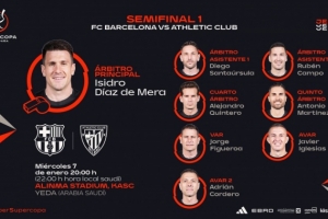 体育资讯1月6日讯 西班牙足协公布了西超杯的裁判安排,德·梅拉执法巴萨vs毕巴,马特奥·布斯克茨·费雷尔执法皇马vs马竞。