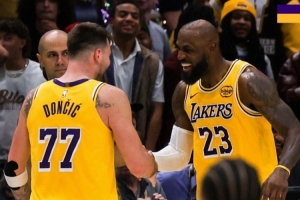 赛后湖人发布赢球海报,詹姆斯和东契奇满脸笑容庆祝瞬间成为封面。