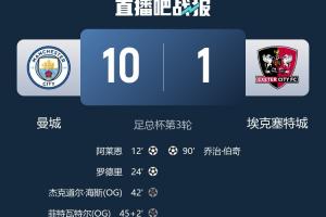 体育资讯01月11日讯 足总杯第3轮,曼城10-1狂胜英甲队埃克塞特城。