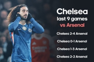 数据统计显示,切尔西各项赛事已连续9战阿森纳均不胜,是近22年最长。他们曾在1999年到2004年间对阵阿森纳连续17场不胜。