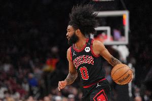 公牛球员科比·怀特上半场手感不佳频频打铁,只命中一个运动战进球,不过在组织策应上做得还是不错。