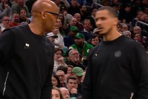 GIF-马祖拉吃T后怒喷裁判!助教卡塞尔来劝他,结果被马祖拉一把摔到一边 ,马祖拉继续追着裁判骂!