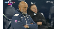 上半场补时阶段,导播给了场边脸色凝重的西汉姆主帅努诺一个超长的镜头。
