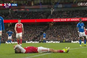 体育资讯02月08日讯 英超第25轮,阿森纳vs桑德兰。比赛第87分钟,特罗萨德突然躺在边线附近,疑似出现伤情。