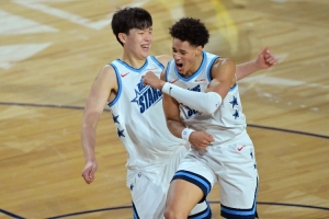 本场杨瀚森5中4砍下10分2板。