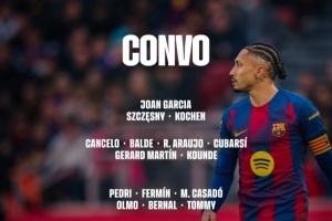 体育资讯3月3日讯 北京时间明天凌晨4点,巴萨将在国王杯半决赛次回合比赛中主场对阵马竞,首回合巴萨0-4落败。巴萨公布了此役的球员名单,莱万因眼眶受伤缺席。