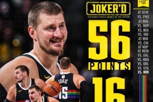本场,约基奇出战43分钟,投篮21中15,三分6中4,罚球23中22,砍下56分16篮板15助攻2盖帽,正负值+15!